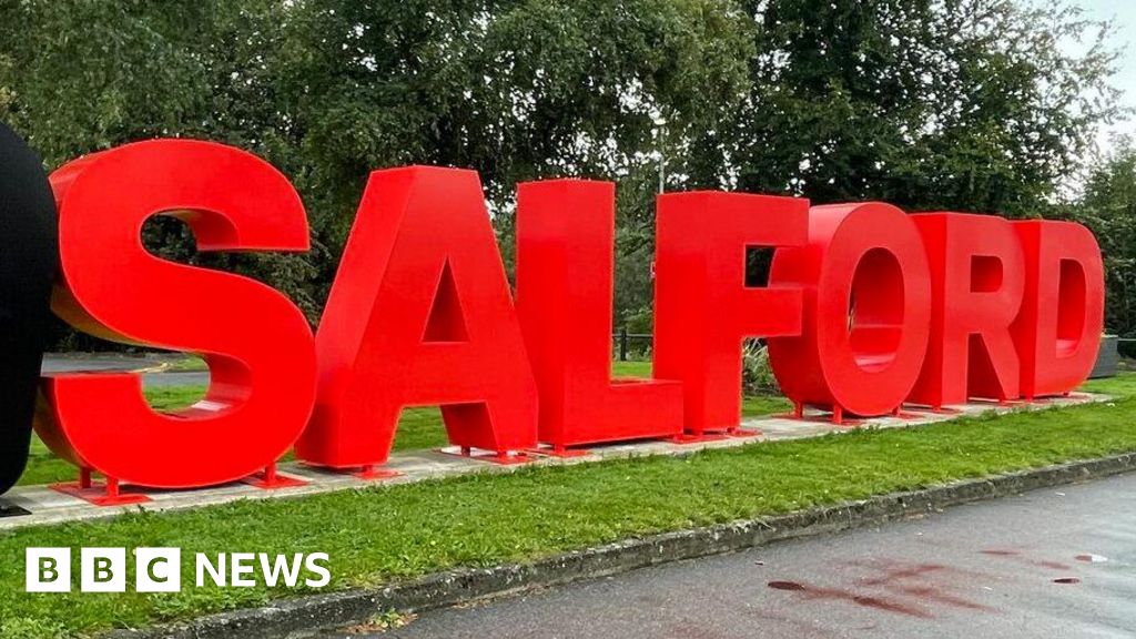 Paul Foster/Geograph A large sign with red letters reading Salford stands on a grey concrete patch of ground, surrounded by green grassPaul Foster/Geograph