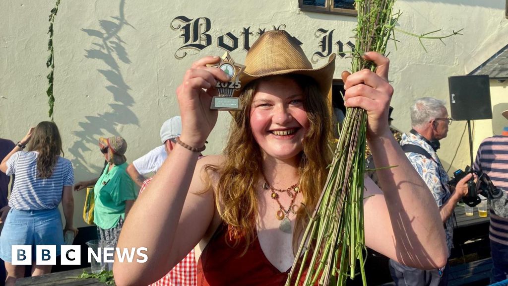 Bridport Town CouncilThe Stinging Nettle Eating World Championships has been revived at a Dorset pub, with the winner chomping through leaves on 74ft (22.5m) on nettle stems.