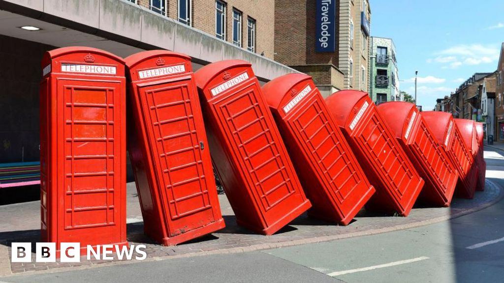 Getty Images A outdoor sculpture on a suburban street consisting of a row of 12 red phone boxes that have collapsed onto each other.Getty Images