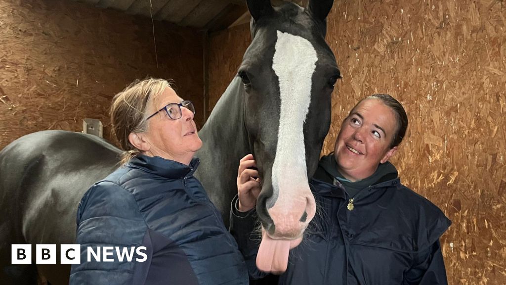 Clare Worden/ BBC Sox is a black or very dark brown horse, with a white stripe running down his face. He is in his stable and flanked by his owners Faye Leneghan and Fay's mum Gabrielle Williams.Clare Worden/ BBC