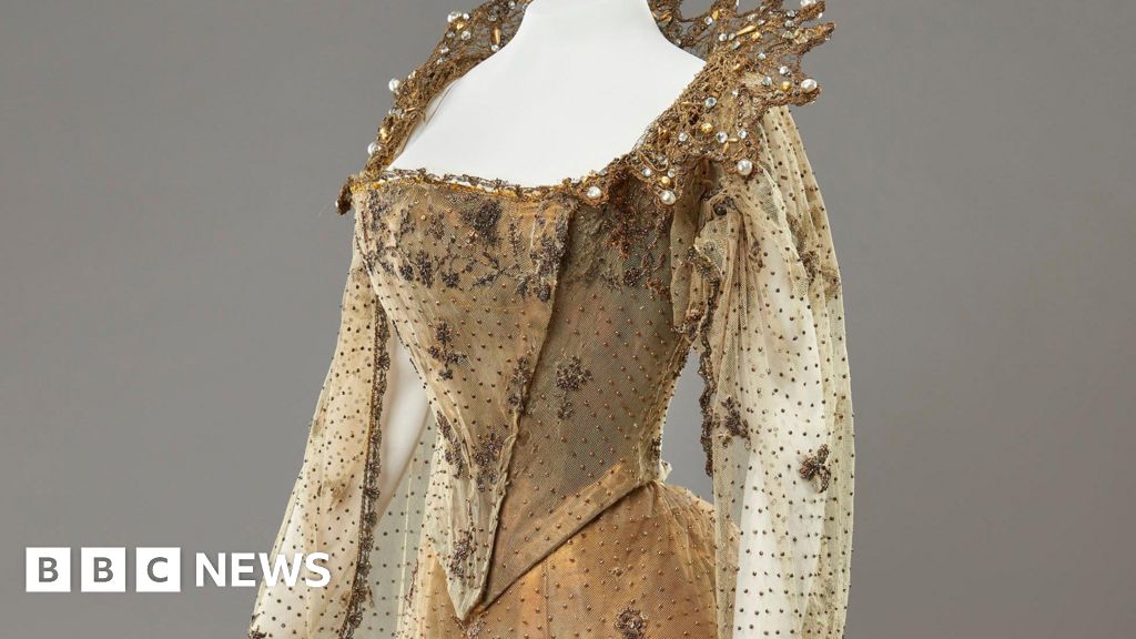 Royal Collection Enterprises Limited 2026 A gold dress hanging on a headless mannequin on a grey background.Royal Collection Enterprises Limited 2026