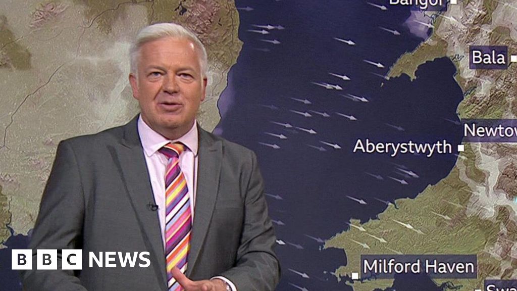 BBC Derek Brockway wearing a grey suit, a colourful tie and pink shirt. She is standing in front of a weather map showing Wales and various towns and cities. BBC