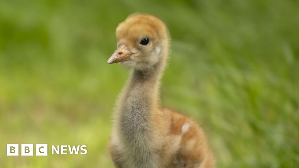 PA Media A small crane chick in grassy part of a nature reserve. The chick is an orange colour with a yellow beak. PA Media