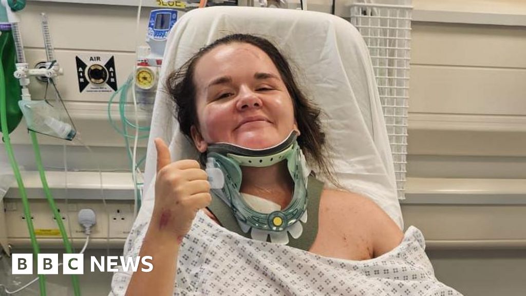 PA Media Rebecca O'Malley in hospital wearing a medical gown and a neck brace. She gives the camera a thumbs up and a faint smile. PA Media