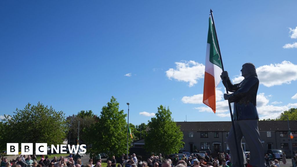 PA Media A crowd gathered around a statue of Bobby Sands, with an Irish flag hanging on it. The sky is clear and blue above. There are some trees and a row of houses in the background. PA Media