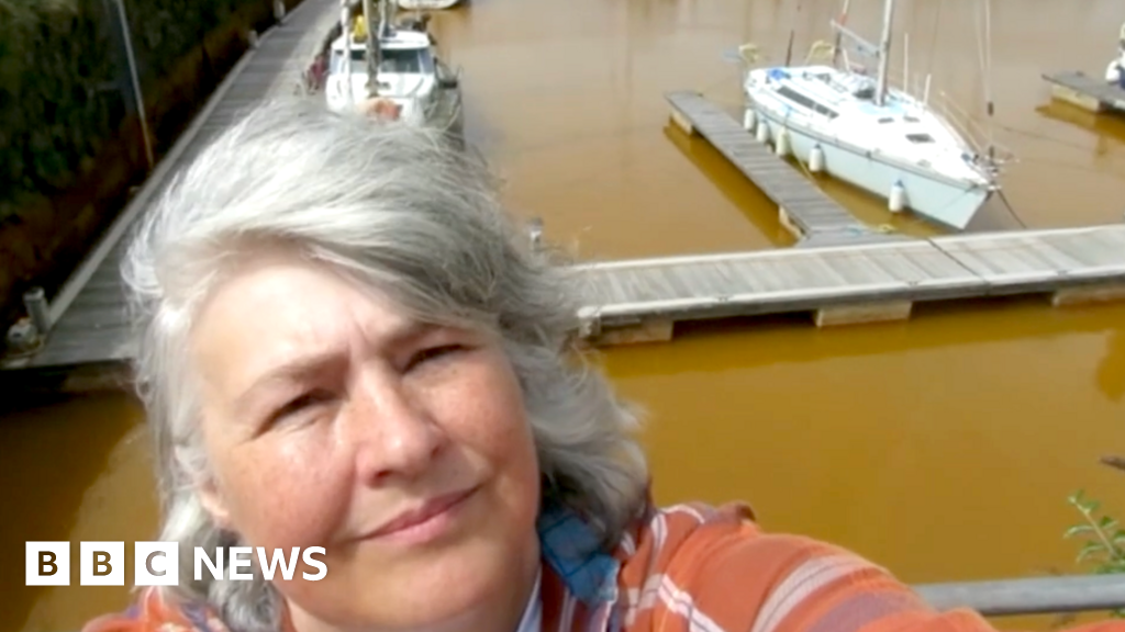 BBC Weather watchers / Gadabout About two-dozen boats are parked up in the harbour. They are connected by a wooden jetty and stairs lead up to the carpark beside it. The water is dark orange.BBC Weather watchers / Gadabout
