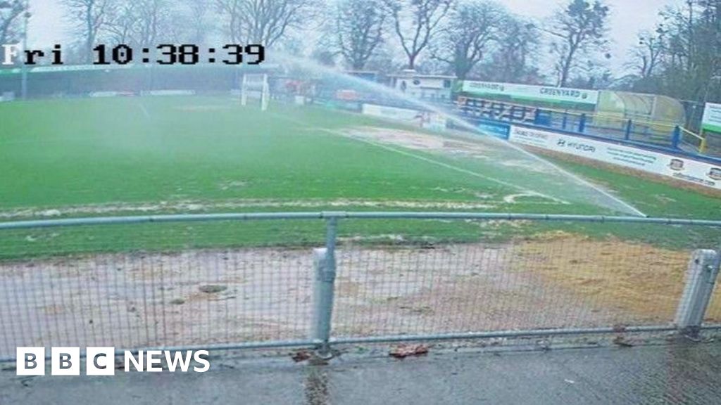 The Non-League Paper A CCTV image showing part of an empty football pitch and terraces, with water spraying from a sprinkler in the corner quadrant. Spectator areas are on the far side of the pitch and on the right.The Non-League Paper