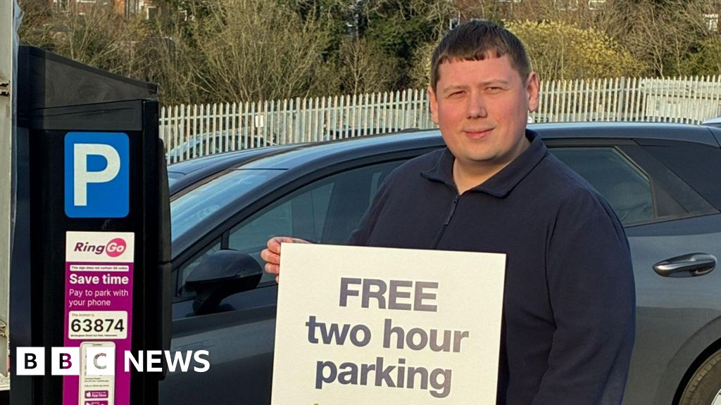 Dudley Borough Council A man holds a white board with the words 'free two hour parking'. He is stood in a car park, with a pay and display machine to his right. A car can be seen behind him.Dudley Borough Council