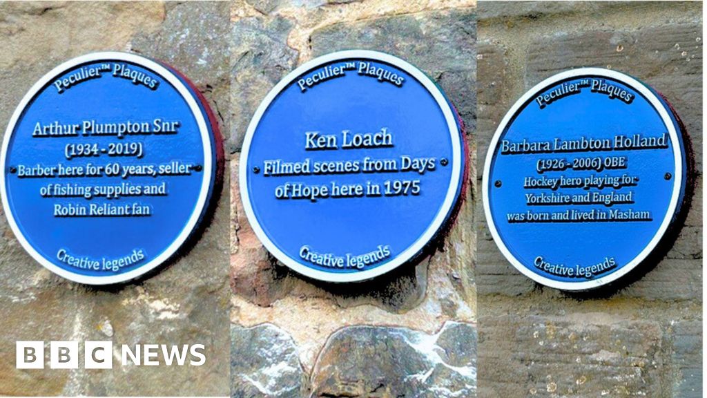 Other plaques celebrate Ken Loach, who filmed scenes from Days of Hope in Masham in 1975; Priscilla Warner, a painter, children's author and illustrator who lived in the town; and Arthur Plumpton, who is described on his plaque as a "barber here for 60 years, seller of fishing supplies and Robin Reliant fan".