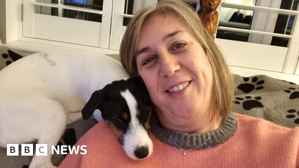 Stephen Price A woman with a blonde-brown bob smiles at the camera, while a small black, brown and white dog rests its head on her shoulder.Stephen Price