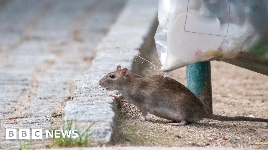 Getty Images A brown rat walking on a footpath underneath a see through bin bag hanging on a pole. The rat has just stretched one forepaw onto the curb.Getty Images