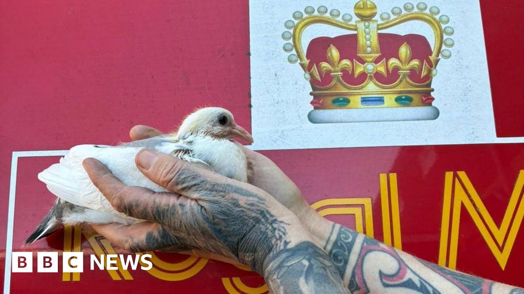 Curious Critters A close-up shot showing someone with tattoos on both arms holding up a white pigeon in their cupped hands. Behind the bird is a red Royal Mail postal van with a crown emblem.Curious Critters
