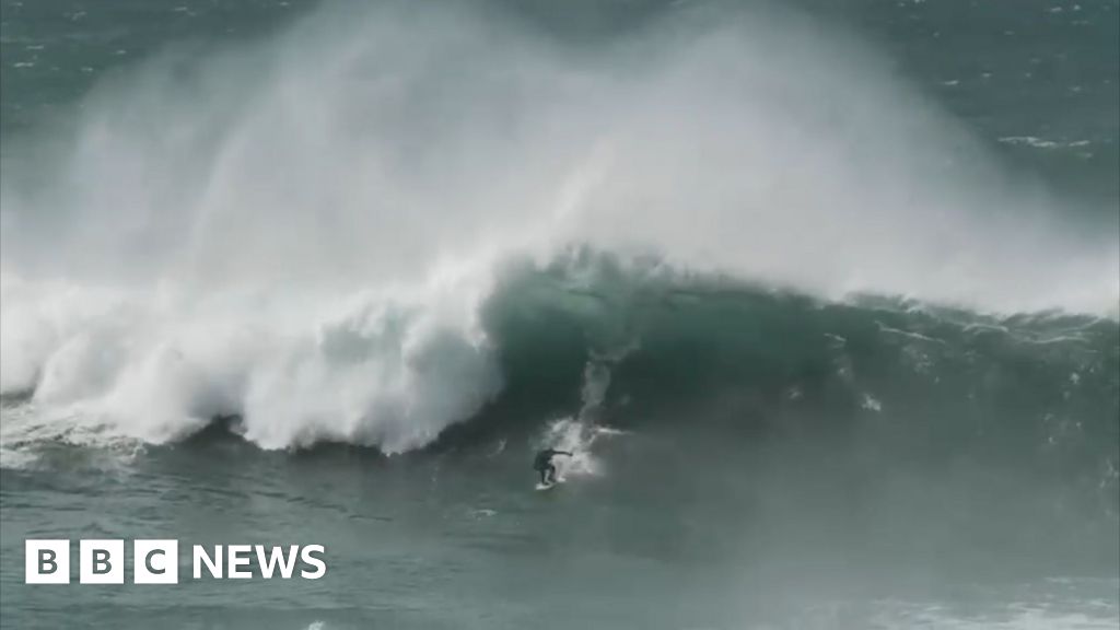 Andrew Douglas and Tom Buttler surfed Cribbar Reef in Newquay, Cornwall, on Tuesday with help from Jules Chenoweth towing them on a jet ski.
