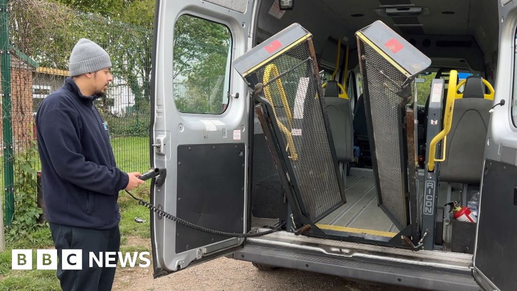 BBC A private hire operator, wearing a wooly hat, uses a handset to lower a lift used to get wheelchairs into the back of a specially adapted minibus.BBC
