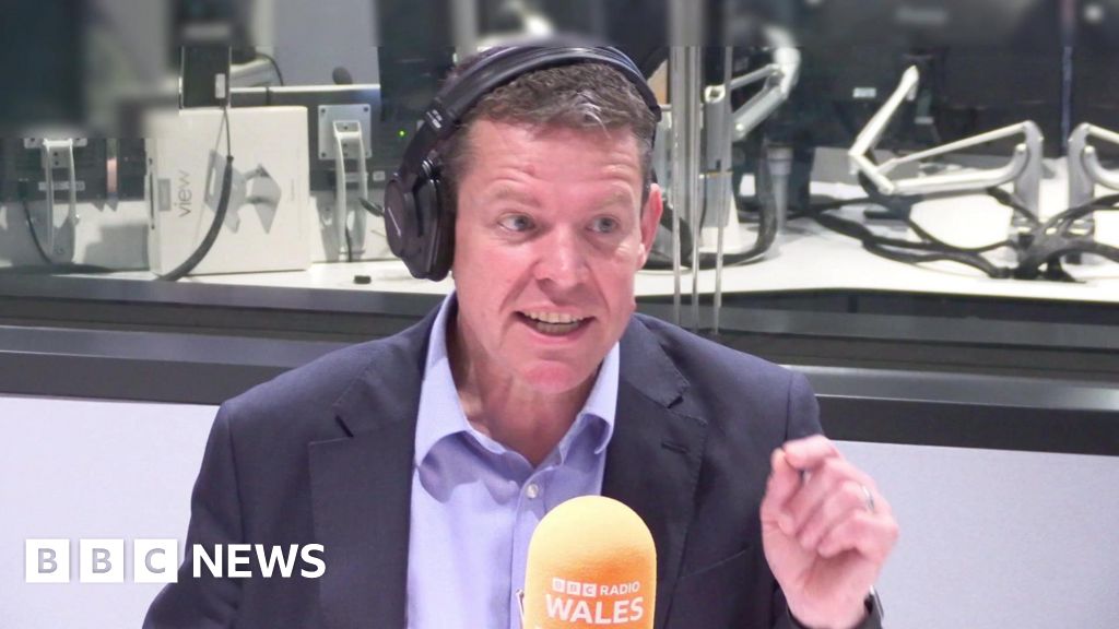 BBC Rhun ap Iorwerth being interviewed in a Radio Wales studio, behind a microphone with an orange foam cover displaying the BBC Radio Wales logo. He is gesturing with his hand and wearing a pair of headphones over one ear. BBC