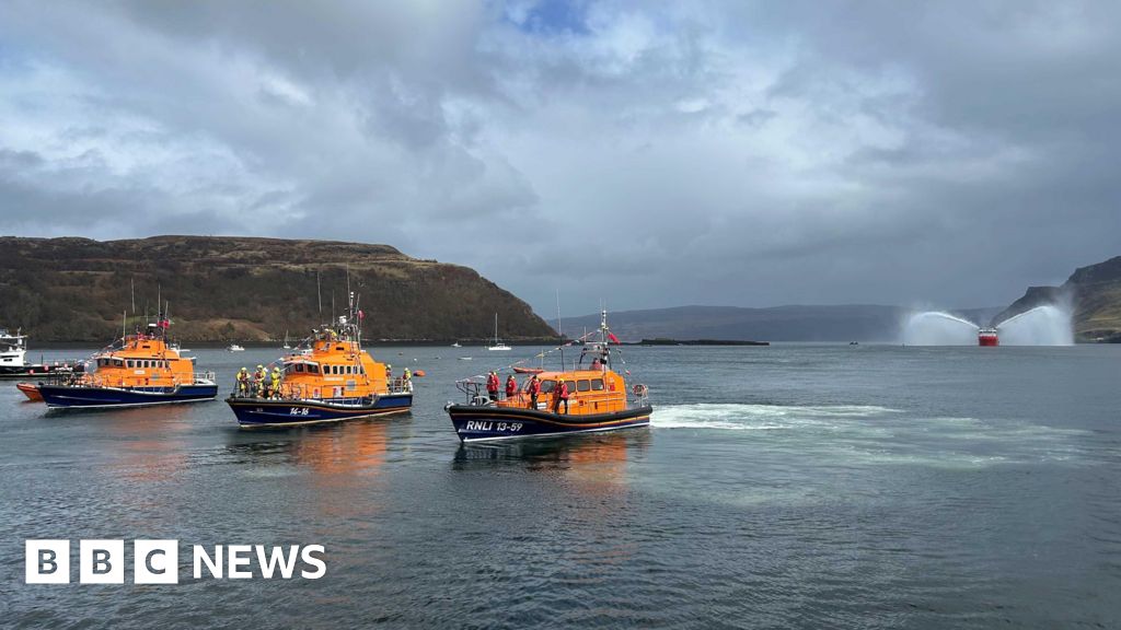 It was guided into Portree by the outgoing Portree RNLI lifeboat, Stanley Watson Barker, and the HM Coastguard emergency towing vessel Ievoli Black, which fired its water canons in a traditional seafaring salute.