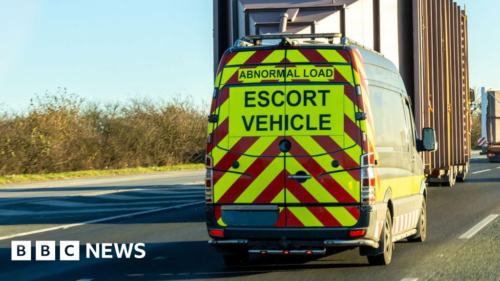 Getty Images A red and yellow striped van marked with 'abnormal load - escort vehicle' drives behind a lorry bearing an oversized square load.Getty Images