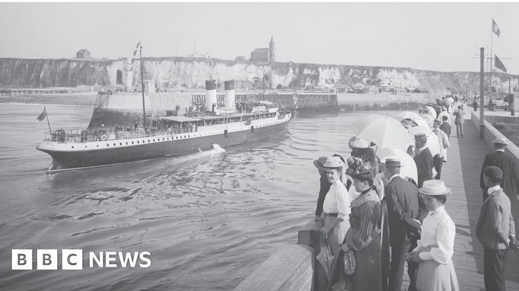 Institut National de l'Audiovisuel A ferry arrives in Dieppe in front of onlookers, some wearing hats and carrying umbrellas, in the early part of the 20th centuryInstitut National de l'Audiovisuel