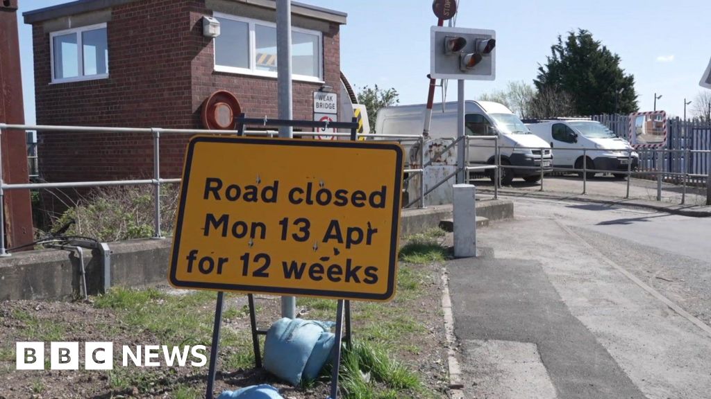 BBC A yellow road sign reading "Road closed Mon 13 Apr for 12 weeks". A red brick building and two vans can be seen in the background. BBC