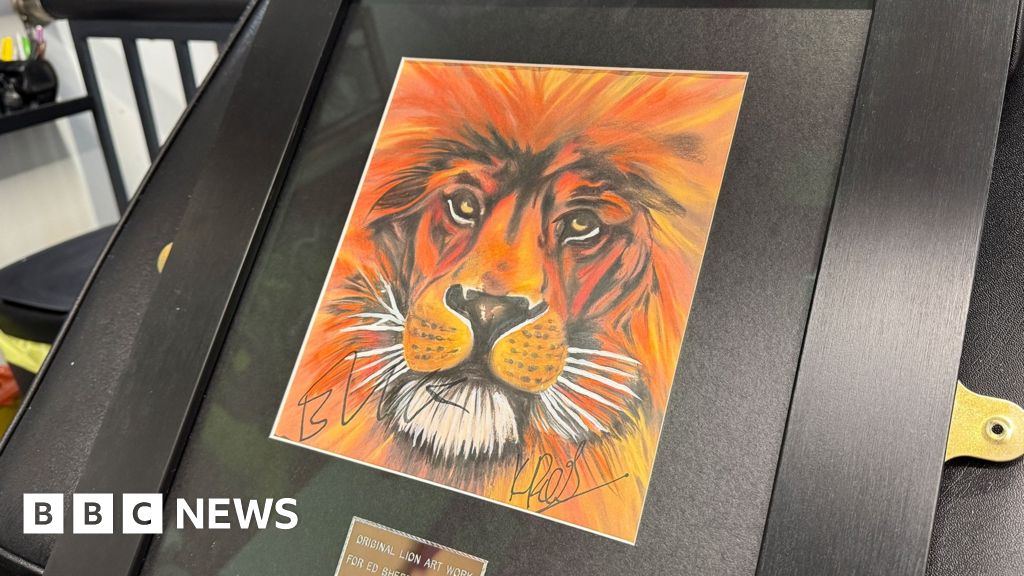 BBCThe original artwork for Ed Sheeran's lion tattoo has gone on sale to raise money for the rehabilitation of prisoners.