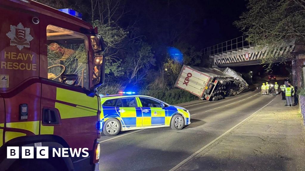 Images released by the fire service showed the lorry partially propped up by the side pillar of the bridge after it tried to drive under. The bridge has a height restriction of 4.3m (14ft, 3in).