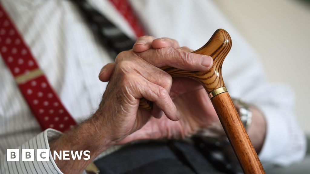 PA Media An elderly man holding a wooden walking stick. The man is wearing a striped shirt and a red tie. His hands are wrinkled.PA Media