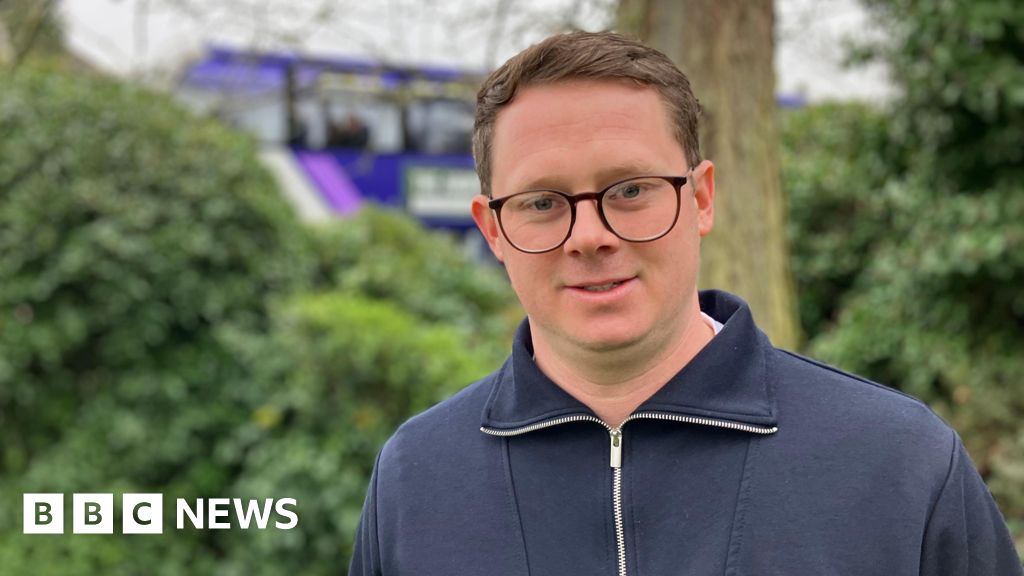 Lewis Adams/BBC Mitchell Jones is wearing a navy zip-up jumper outdoors. He has short brown hair and glasses with dark rims. Behind him are bushes and a tree, as well as a purple bus driving by.Lewis Adams/BBC