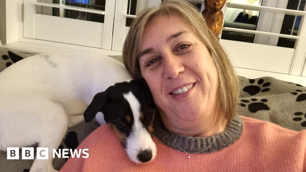 Stephen Price A woman with short blonde hair is sitting on a sofa and smiling. She is resting her head on her dog which is on her shoulder, and appears to be a white Jack Russell.Stephen Price