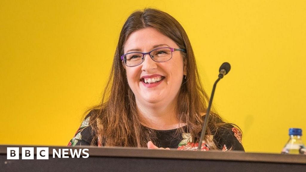 Neil Harrison Photography / Alliance A woman with long brown hair wears purple-framed glasses. She has a black top with floral pattern. She is smiling against a yellow backdrop, stood in front of a microphone.Neil Harrison Photography / Alliance