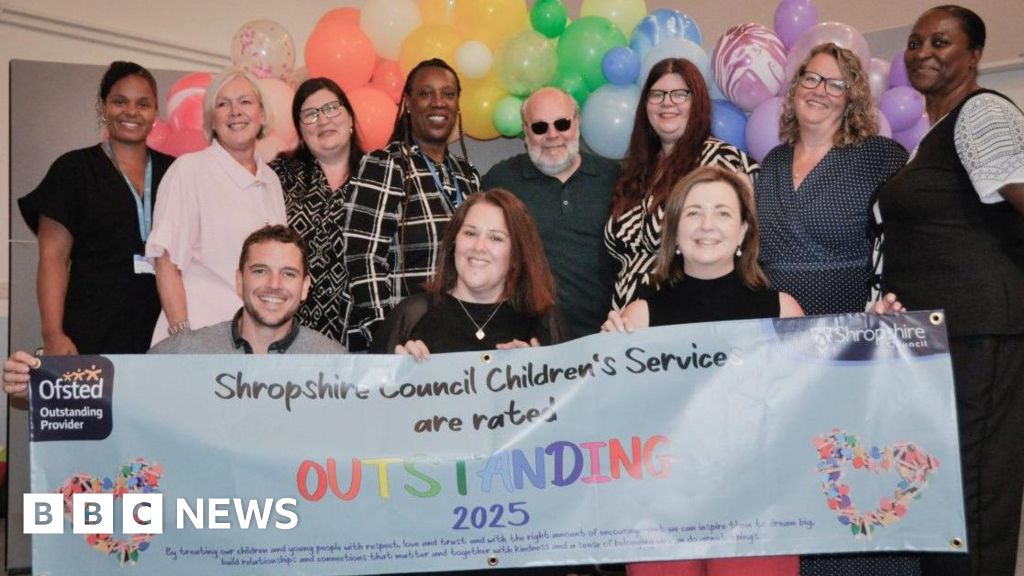 Shropshire Council Eleven people stand near a banner saying Shropshire Council Children's Service are rated outstanding 2025.Shropshire Council