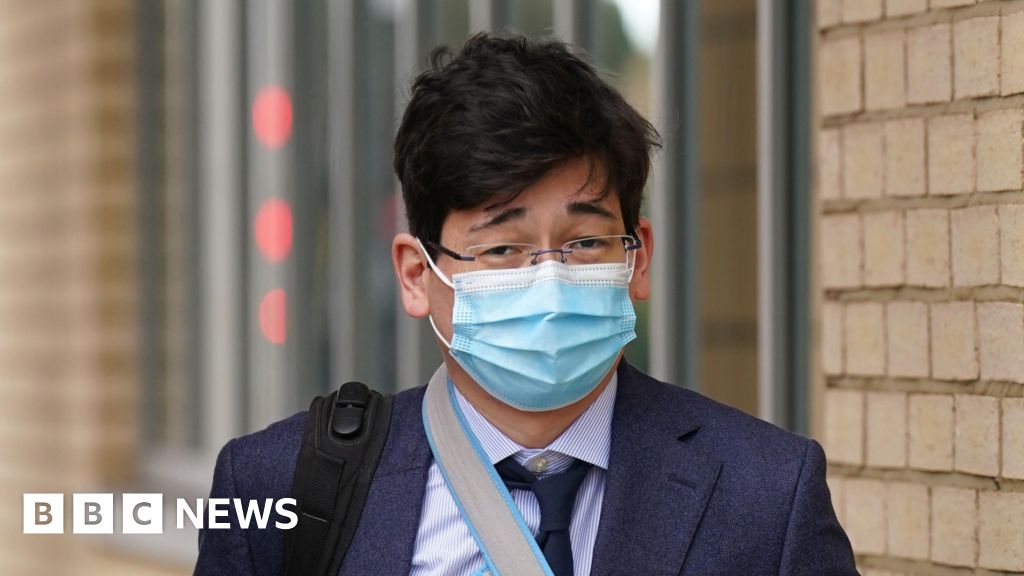 PA Media Jonathon Dean wearing a navy suit with a navy tie and a white shirt and glasses. He is walking outside of a court building with the strap of a black rucksack over one shoulder and a facemask on.PA Media