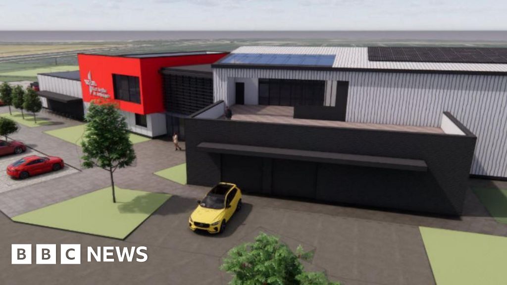 Fabric First Architects/East Anglian Air Ambulance Artist's impression of the new East Anglian Air Ambulance base. It is a series of warehouse-looking buildings. In front is parking and some cars, with some grass and four trees. Beyond it is flat arable countryside. Fabric First Architects/East Anglian Air Ambulance