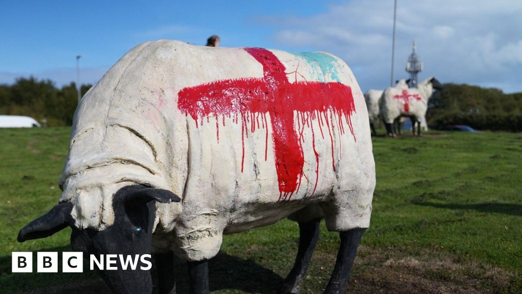 Leanne Brown/BBCRed crosses have been daubed on sculptures of sheep on a North Yorkshire roundabout, drawing criticism from a local councillor.