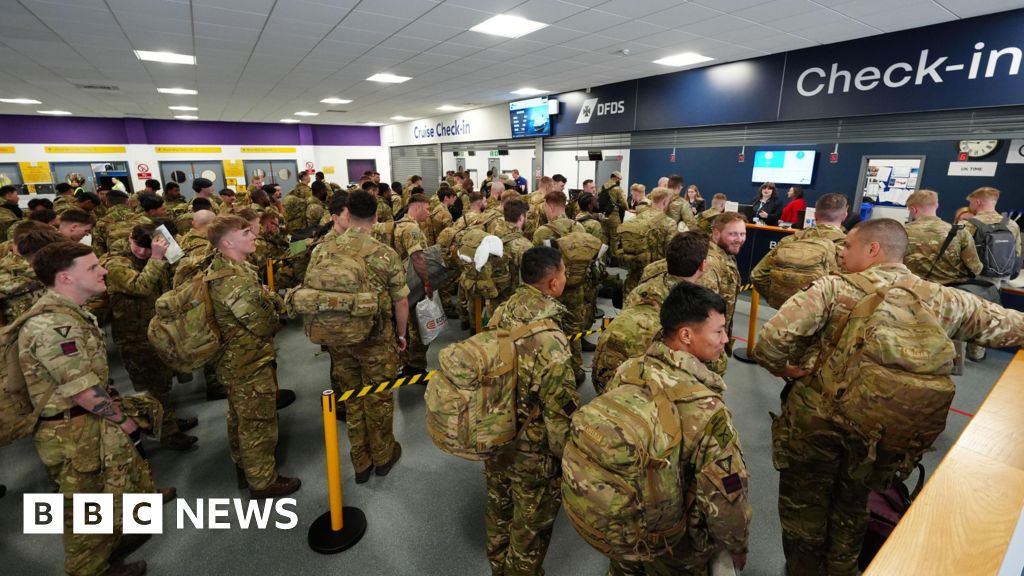 PA Media/Owen Humphreys Lines of soldiers at the check-in desks at the ferry port. They are all wearing camoflauge clothing and have backpacks.PA Media/Owen Humphreys