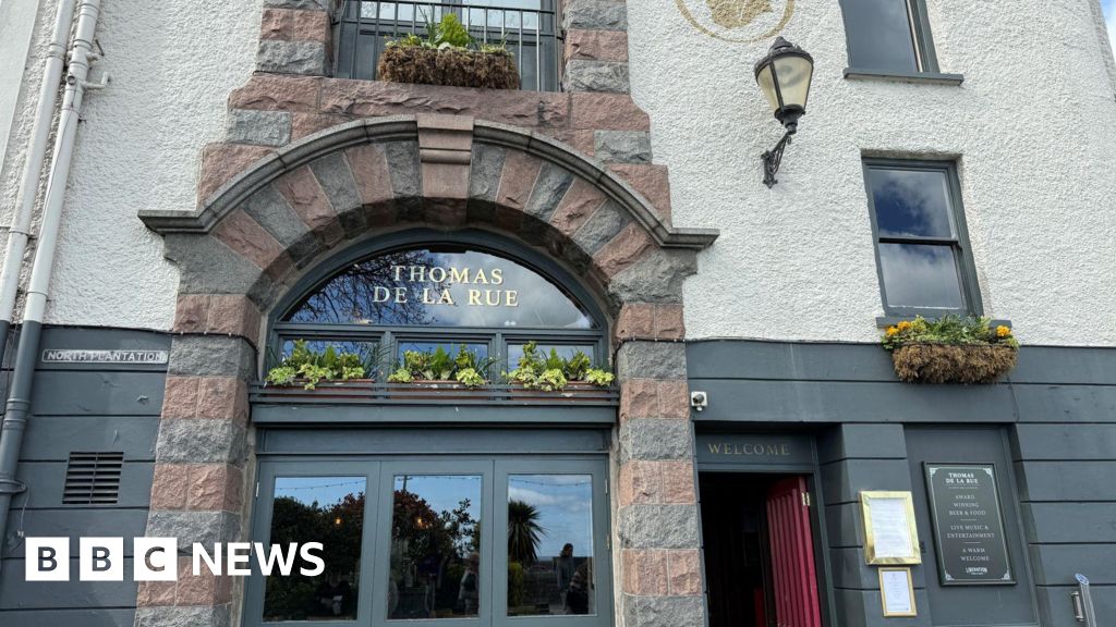 BBC A historic pub frontage with a stone archway entrance and a sign reading “Thomas De La Rue” above the door. The building has an off white plaster walls with grey stone accents, window boxes filled with green plants and yellow flowers, and a street sign for “North Plantation” on the left. The red entrance door is open above which hangs a large wall lamp. A glass winder reflects trees and sky outside.BBC