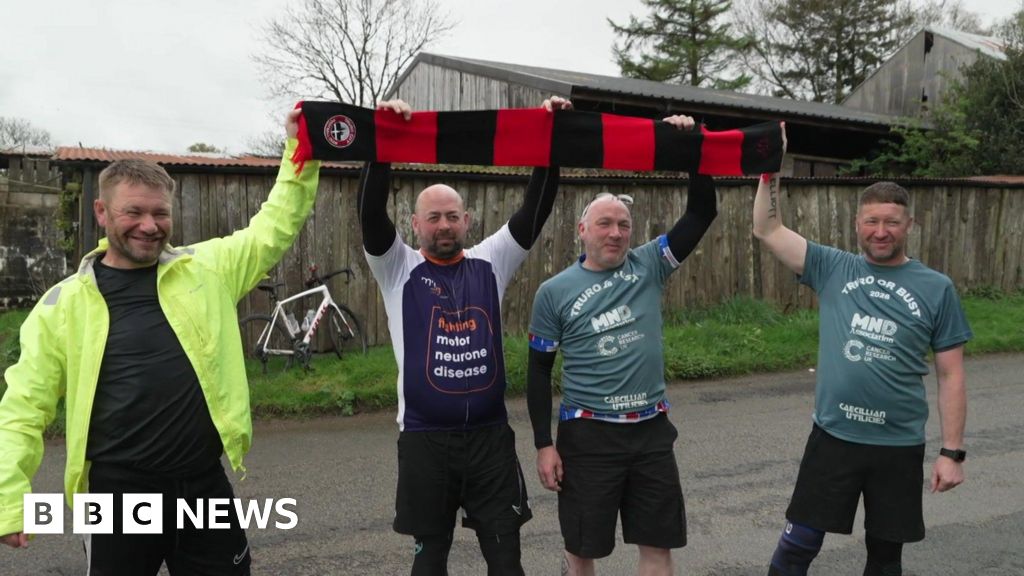 BBCFootball fans have arrived in Cornwall after travelling more than 500 miles (805km) over six days to watch their team play and raising money for charity.