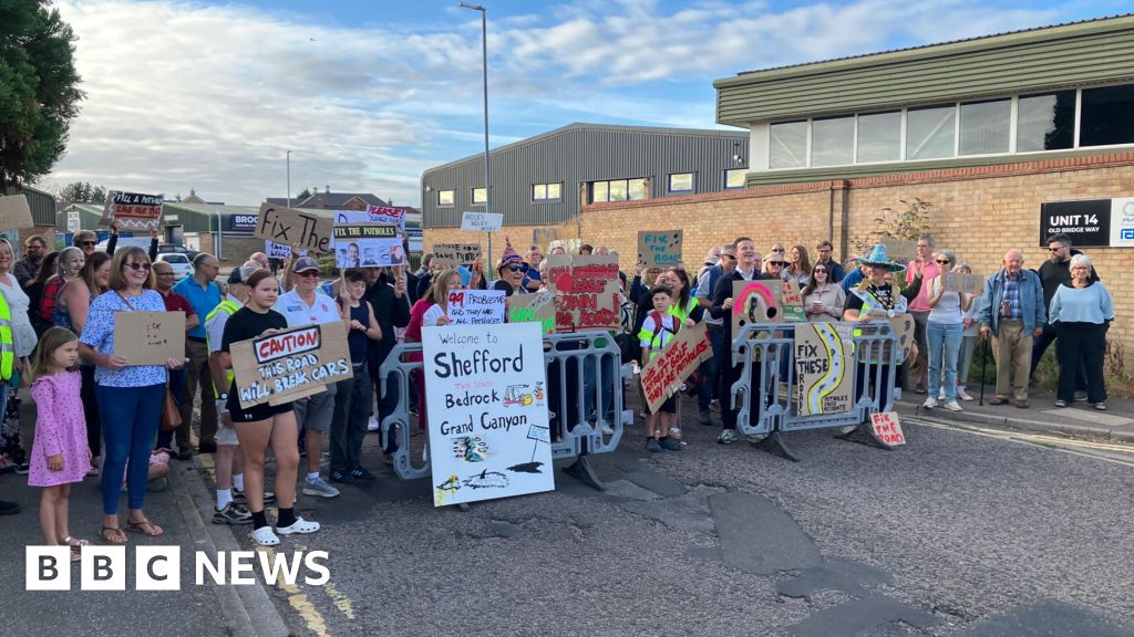 Amy Holmes/BBCDuring the protest, young people in high-viz jackets played golf on the road to highlight the size of some of the potholes, and one campaign sign suggested Shefford should be twinned with Bedrock from The Flintstones TV show or the Grand Canyon, because of the state of Old Bridge Way.
