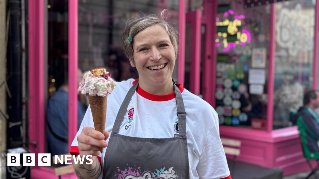 James Dunn/BBC A women with short hair smiling at the camera. She is wearing a red and white England rugby T-shirt and is holding an ice cream cone with white ice cream on top. She is standing in front of a pink shop front.James Dunn/BBC