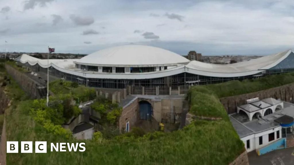 BBC An aerial view of Fort Regent showing a large white roof with greenery surrounding it.BBC