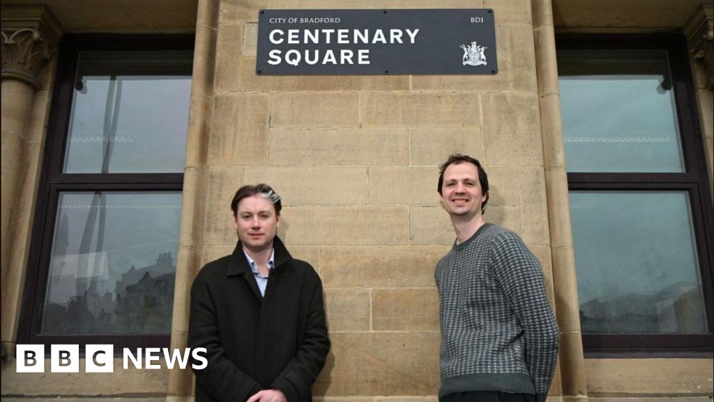 LDRS Two men stand below a smart black sign saying City of Bradford Centenary Square, which also features Bradford's civic crestLDRS