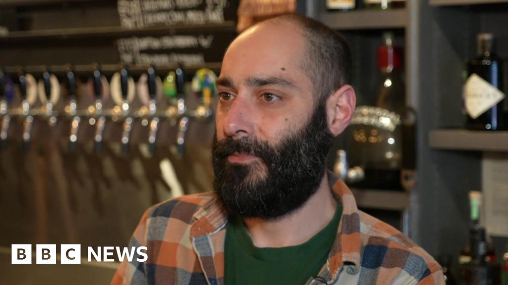 BBC A man with a beard and short hair is inside a bar, with rows of beer taps and chalkboard menus visible in the background.BBC