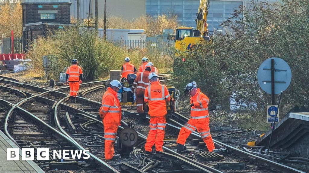 Getty Images A group of Network Rail engineers dressed in bright orange protective clothing work on the railway tracks at Three Bridges railway station in Crawley, UK.Getty Images