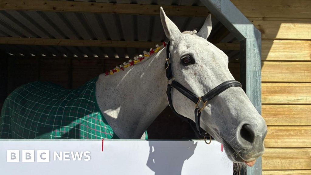 BBC A close up of a grey horse's head looking out of a stable door.BBC