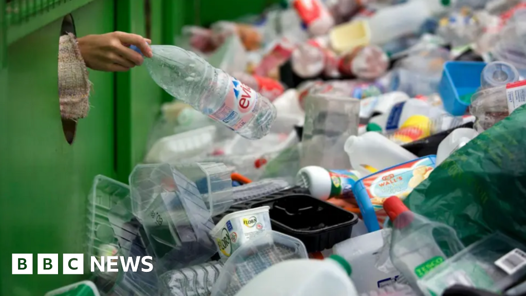 Getty Images A large pile of plastic bottles and containers with a hand reaching through a hole in a green plastic wall to place another one insideGetty Images