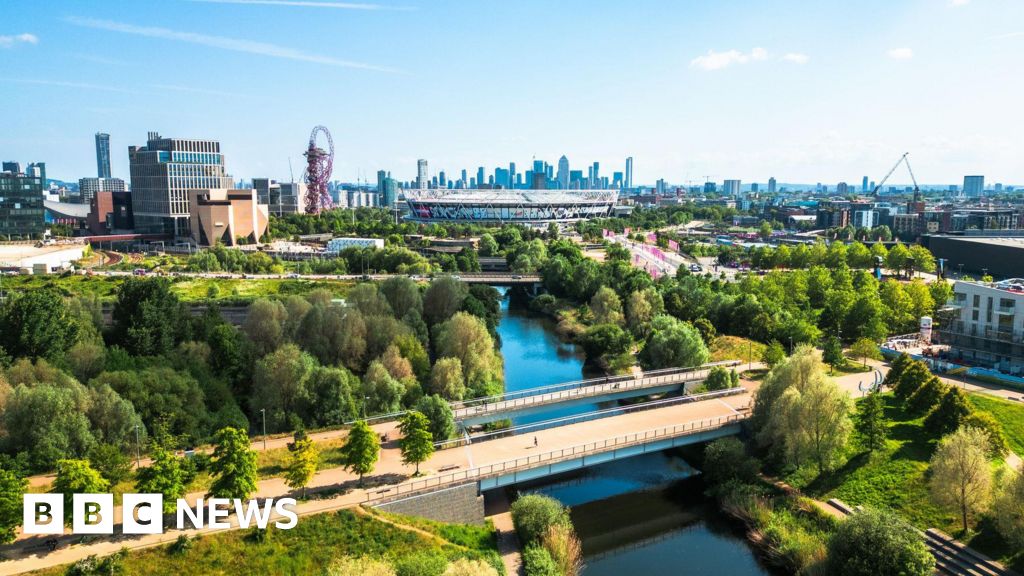 Getty Images Large curved metallic leaf sculptures in Stratford, east London, with high‑rise buildings and red double‑decker buses in the background.Getty Images
