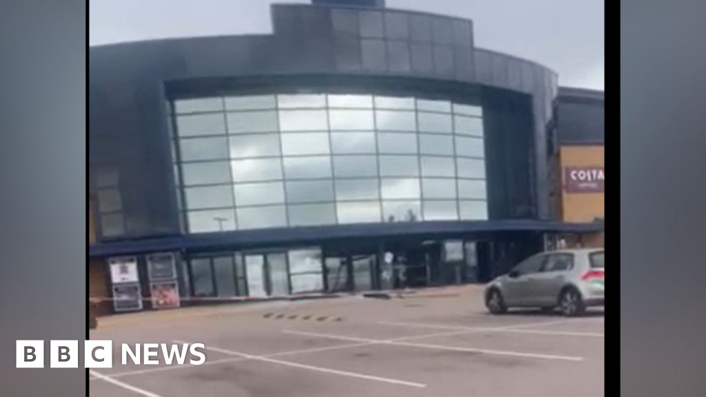 Nancy Bryant A still taken from a video, which is slightly blurry. It shows the front of the cinema with glass doors damaged, and red hazard tape across the car park. Above the main doors are glass mirrored panels.Nancy Bryant