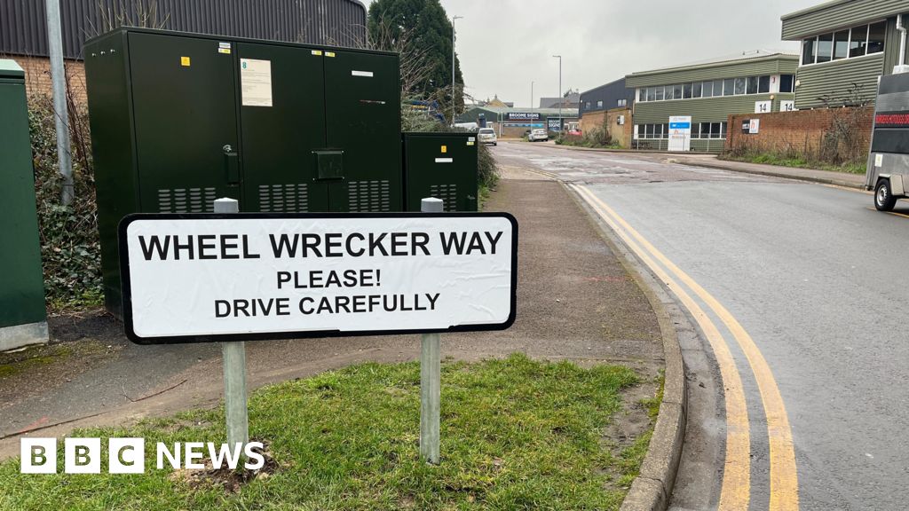 Tony Fisher/BBCA road sign has been rewritten as "Wheel Wrecker Way", highlighting the problem of potholes.
