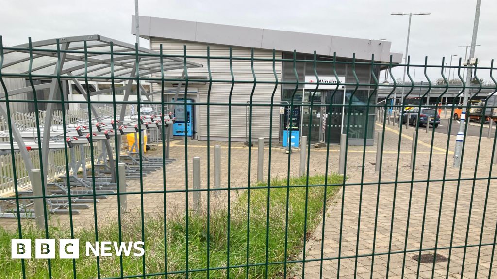 Amy Holmes/BBC A fenced-off area outside a small modern station building in Winslow, Buckinghamshire, with bike racks on the left and ticket machines near the entrance.Amy Holmes/BBC