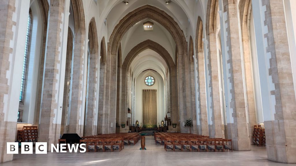 Simon Furber The inside of Guildford Cathedral. There are very high ceilings and two rows of chairs flanked either side of an aisle leading to the altar. Simon Furber