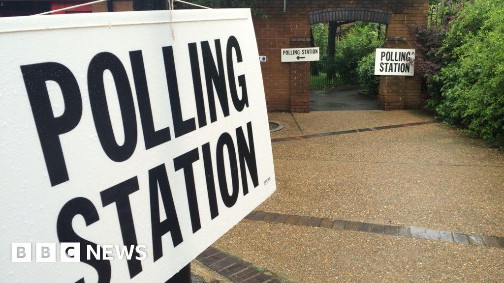 BBC A generic image of a white sign with black lettering for a polling station. In the background there is an arched entrance to a building's garden with further signs pointing to a polling station.BBC